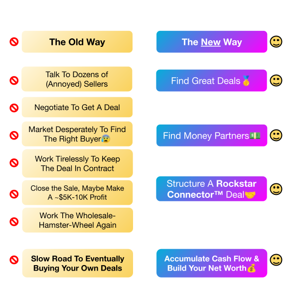 You'll learn how to become focused by flipping the script and finding the fast-track into acquisitions by becoming a Rockstar Connector™ - Where you can elevate your path from wholesale or "some-day" to becoming a buyer.